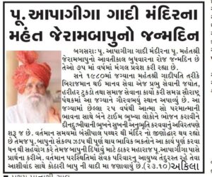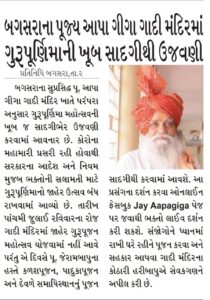 અહીંના સુપ્રસિદ્ધ આપાગીગા ગાદી મંદિરમાં પરંપરાગત રીતે ગુરૂપૂર્ણિમા મહોત્સવની ઉજવણી કરવામાં આવી હતી. ગુરુ પૂર્ણિમાનું દિવ્ય મહત્વ વર્ષ દરમિયાન આવતી તમામ પૂર્ણિમાઓમાંથી, આ